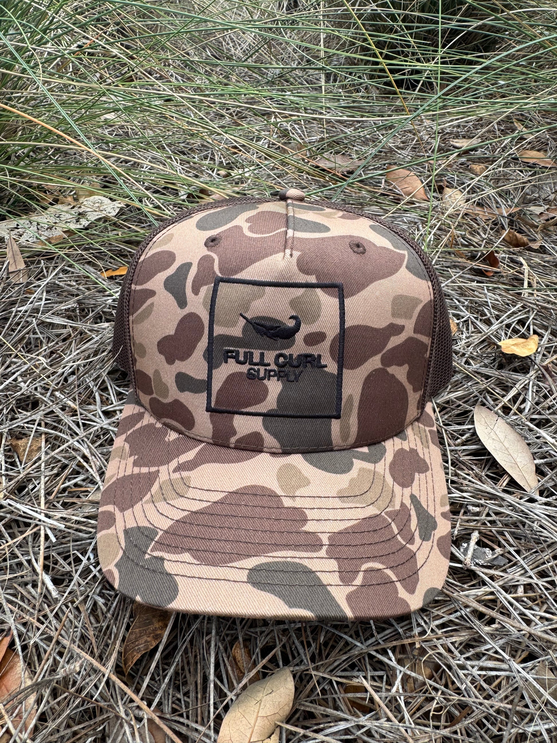 A classic duck camo trucker with our Full Curl Supply Logo. Durable, breathable, and ready for the field or everyday wear.
